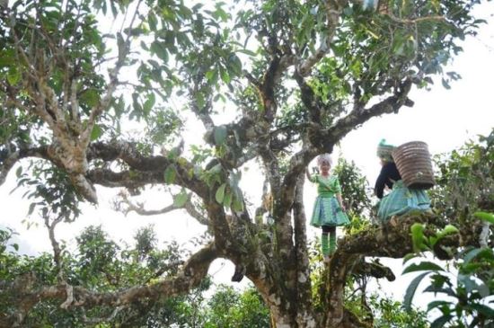 Những cây chè với tuổi đời lâu năm, có những cây cao hàng chục mét, tán lá xòe rộng. Mỗi lần thu hoạch người nông dân phải chèo lên trên cao và hái từng lá trà.